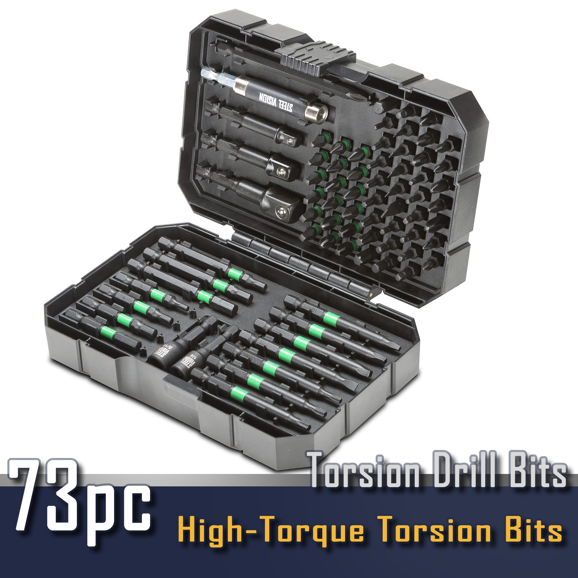 Details: The Steel Vision Tools 73 pc Torsion Bit Set is a versatile and comprehensive collection of high-performance bits, perfect for professionals and DIY enthusiasts. This set includes a variety of Phillips, Pozi, Square, Slotted, Star, and Hex bits in 1", 2", and 3" lengths, making it ideal for any fastening job. The torsion bits are designed to handle high torque without wearing down quickly, ensuring a longer lifespan. With included nutsetters, adapters, and an extension bit holder, this kit provides a reliable and flexible solution for all your tool needs. Whether you're working in tight spaces or handling high-torque applications, this set has you covered.